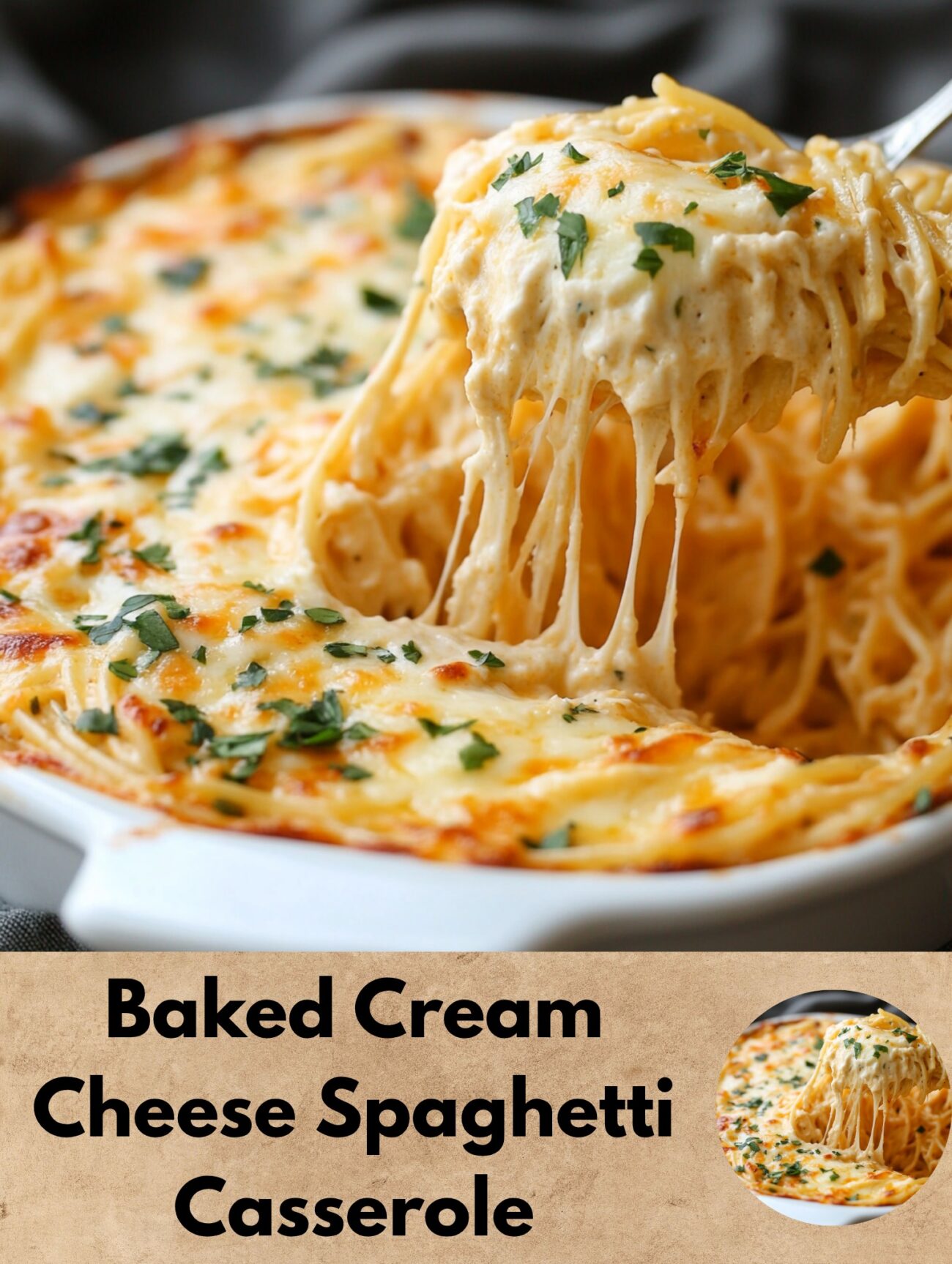 You start by browning ground beef with onion and garlic and stirring in your favorite spaghetti sauce to make a simple, savory meat sauce. While that simmers, you toss hot, just‑drained spaghetti with softened cream cheese, Parmesan, Italian seasoning, and a splash of pasta water until it turns glossy and silky. Everything gets layered into a baking dish—meat sauce on the bottom, creamy spaghetti in the middle, more sauce on top, then a thick blanket of shredded mozzarella—before going into the oven until the edges bubble and the cheese on top melts and browns.