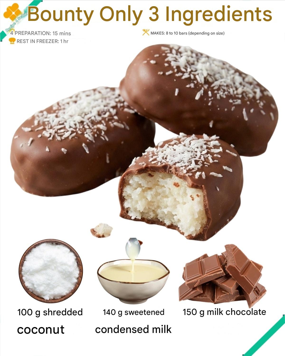 I still remember the first time I made these three-ingredient Bounty bars in my kitchen—the moment the shredded coconut hit the sweetened condensed milk, the whole room filled with that unmistakable tropical aroma that instantly lifted my mood. It felt almost unbelievable that something so quick, so simple, and so inexpensive could taste exactly like the classic candy bar I grew up loving. As the bars chilled in the freezer, I kept peeking in like a kid waiting for dessert, and when I finally dipped them into the warm melted chocolate, I knew this would become one of my go-to no-bake treats.