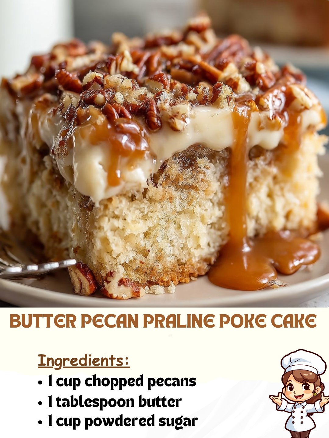 Poke cakes became popular in America in the 1970s as a fun, practical way to add moisture and flavor to boxed cake mixes—made iconic by their colorful gelatin layers or sweetened milks seeping into poked holes. The butter pecan praline twist nods to classic Southern pralines and butter cakes—caramelly, nutty, and lush.