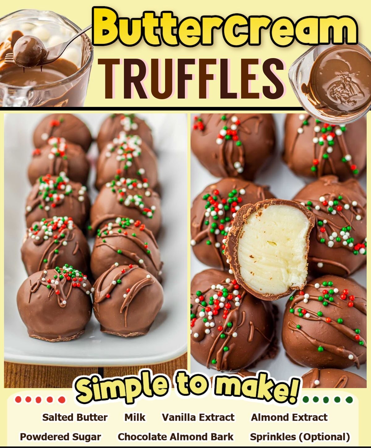 Once you gather everything, you’ll see how simple and flexible this recipe really is. If you don’t like almond extract, you can easily leave it out or swap it for more vanilla. The chocolate coating can be almond bark, chocolate chips with a tablespoon of shortening, or even dark chocolate if you prefer a richer flavor. The sprinkles are obviously optional, but I’ll admit I almost always add them because they make the truffles look festive with almost zero effort.