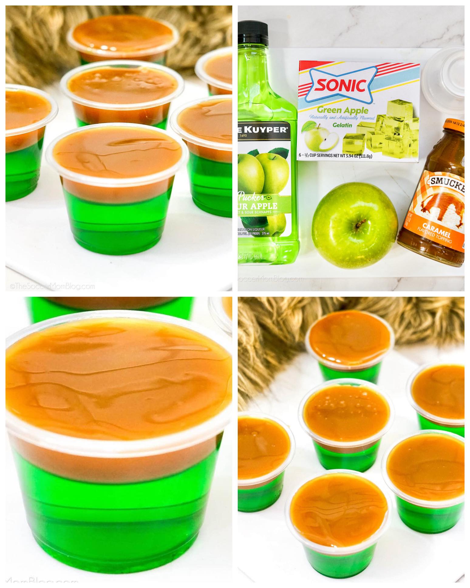 After gathering everything, I always check my caramel sauce. Some store-bought versions are thicker, and some are runny, so you might need to warm it slightly so it spreads smoothly. You can also swap the schnapps for vodka if you want a milder apple flavor or adjust the alcohol amount depending on your group. The gelatin flavor really matters here—green apple gives that signature tartness, so I wouldn’t substitute unless you absolutely can’t find it.
