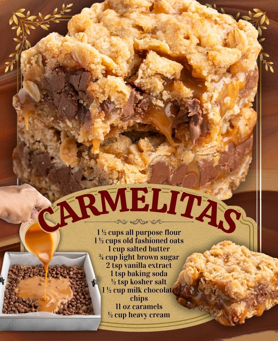 The first time I made CARMELITAS, my entire kitchen filled with the buttery, brown-sugar aroma that tells you something incredible is happening in the oven. As the oatmeal crust baked, it turned golden and fragrant, and I remember standing there watching the caramel melt with the chocolate chips like a tiny lava flow in my saucepan. When I layered everything together—the warm crust, the silky caramel, the melted chocolate—I had to stop myself from diving into the pan before it even went back into the oven. And when it finally came out, bubbling gently around the edges and smelling like pure dessert heaven, I knew instantly that this was one of those recipes that becomes an instant classic.