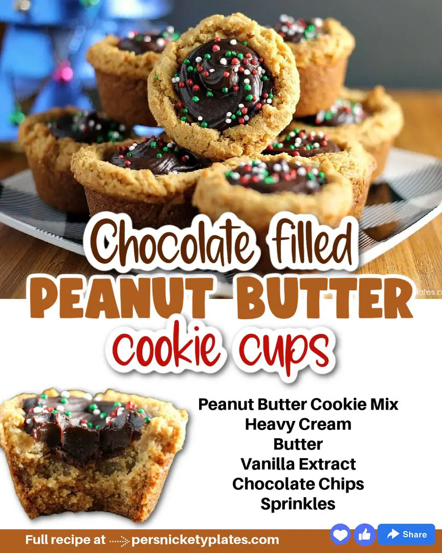The very first time I made these chocolate filled peanut butter cookie cups, my kitchen smelled like the coziest bakery imaginable—rich peanut butter sweetness wrapped around warm, melty chocolate. I remember pulling the mini muffin pan from the oven and seeing the golden cookie shells puffed up beautifully, just waiting to be filled. When I spooned in that glossy chocolate ganache and sprinkled colorful sprinkles on top, I knew instantly this recipe was going to become one of my all-time favorites. That first bite sealed the deal—it tasted like the perfect marriage of a peanut butter cookie and a rich chocolate truffle.