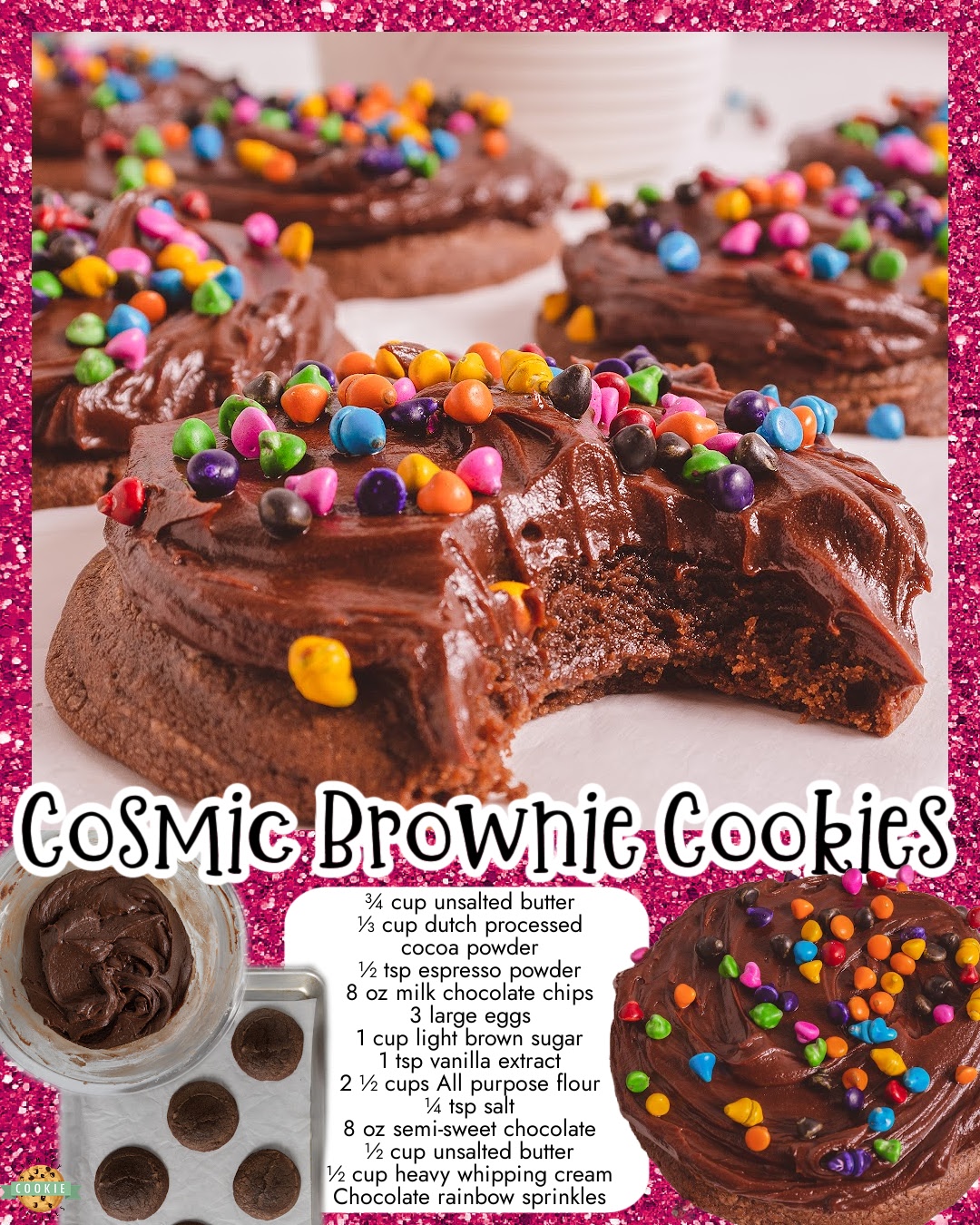 You’ll love these Cosmic Brownie Cookies because they capture everything nostalgic about the lunchbox treat but elevate it into a bakery-style, thick, melt-in-your-mouth cookie. You get that deep chocolate flavor, the soft brownie center, the creamy frosting on top, and the fun sprinkle crunch—all in one bite. These cookies feel playful but taste decadent, and the best part is how surprisingly easy they are to make. If you love fudgy desserts, this recipe is about to become your new obsession.