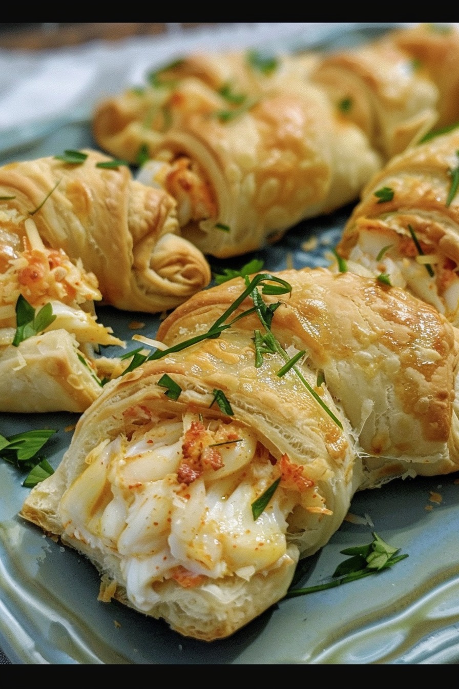 Each roll bursts with the gentle sweetness of crab and tangy cheddar or cream cheese, wrapped in a delicate crescent that browns beautifully as it bakes. The filling is creamy, savory, and dotted with herbs or green onions, making every bite memorable.