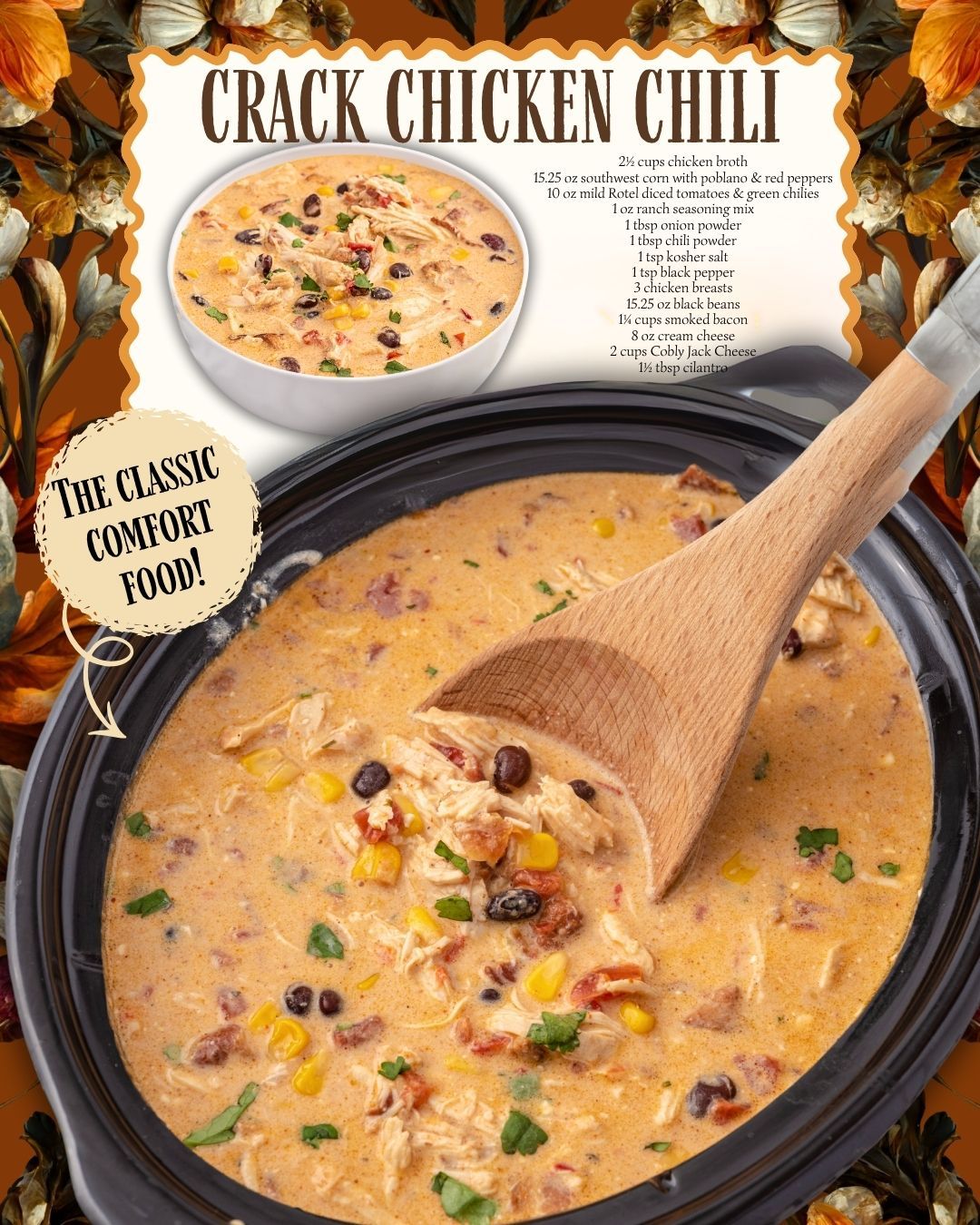 The first time I made CRACK CHICKEN CHILI, my entire kitchen filled with the kind of cozy, savory aroma that makes you instantly feel at home. As the chicken simmered with the spices, beans, bacon, and creamy ranch mixture, the smell was so comforting I kept lifting the lid just to breathe it in. I remember standing over the pot, hearing that gentle bubbling sound, and thinking, “This is exactly the kind of meal you want on a chilly night.” When I finally tasted it—the creamy broth, the tender chicken, the hint of ranch, and the slight heat—it felt like the culinary equivalent of a warm blanket. This is one of those recipes I now make when I want something hearty, indulgent, and guaranteed to make everyone at the table happy.