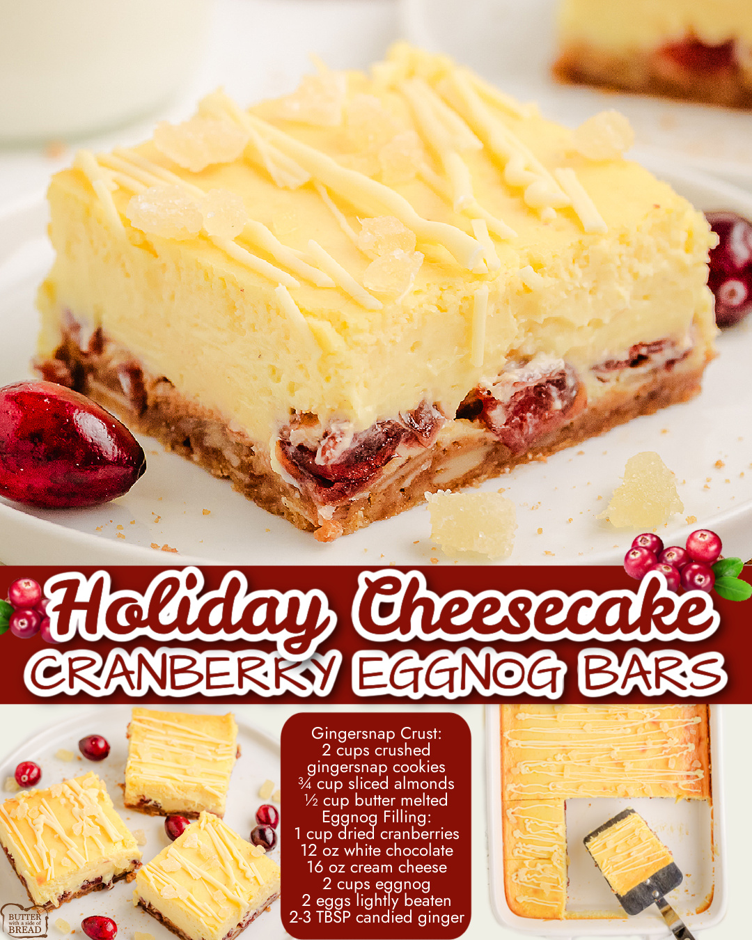 I love using gingersnap cookies because their flavor stands up beautifully against the sweetness of the cheesecake. If you prefer a milder crust, you can replace half the gingersnaps with crushed graham crackers. Sweetened cranberries work too, but I prefer dried cranberries because they soften perfectly when baked. The white chocolate adds richness without overpowering the eggnog. As for the candied ginger, don’t skip it—it adds a gentle zing that brightens the entire dessert.