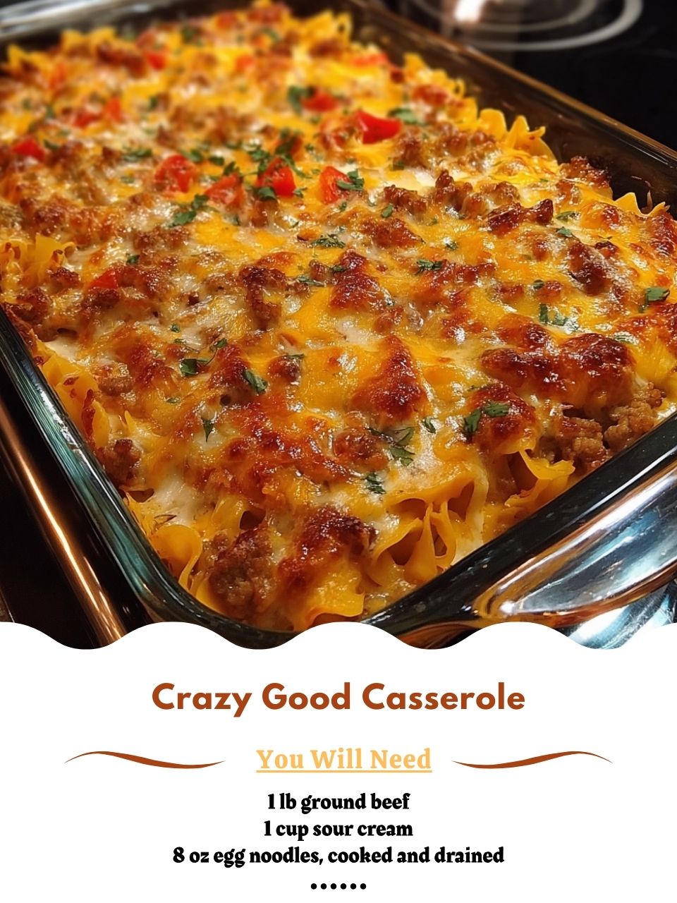 This recipe truly earned its name in my kitchen. I was looking for a way to use up leftover egg noodles and a pound of ground beef, and I started throwing things together—a little sour cream, some pantry staples. I didn’t expect much, but as it baked, a rich, savory aroma filled my house, a blend of browning cheese, creamy sauce, and hearty beef. When I pulled the bubbling dish from the oven and scooped out that first steamy serving, the taste was a revelation. It was creamy, savory, comforting, and utterly moreish. My family declared it “crazy good,” and the name stuck. It’s been our go-to cozy dinner ever since.
