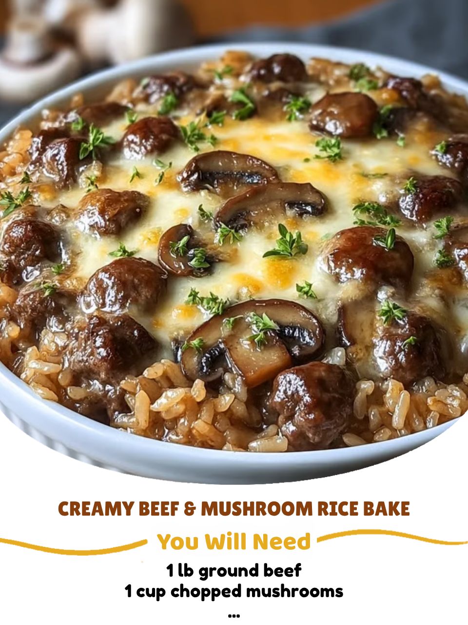 Creamy Beef & Mushroom Rice Bake is the kind of comforting, old-fashioned dinner that fills your kitchen with irresistible aromas and makes every bite feel warm and satisfying. With juicy ground beef, golden sautéed mushrooms, and perfectly cooked rice simmered right in a creamy, savory sauce, this dish delivers pure homestyle goodness.