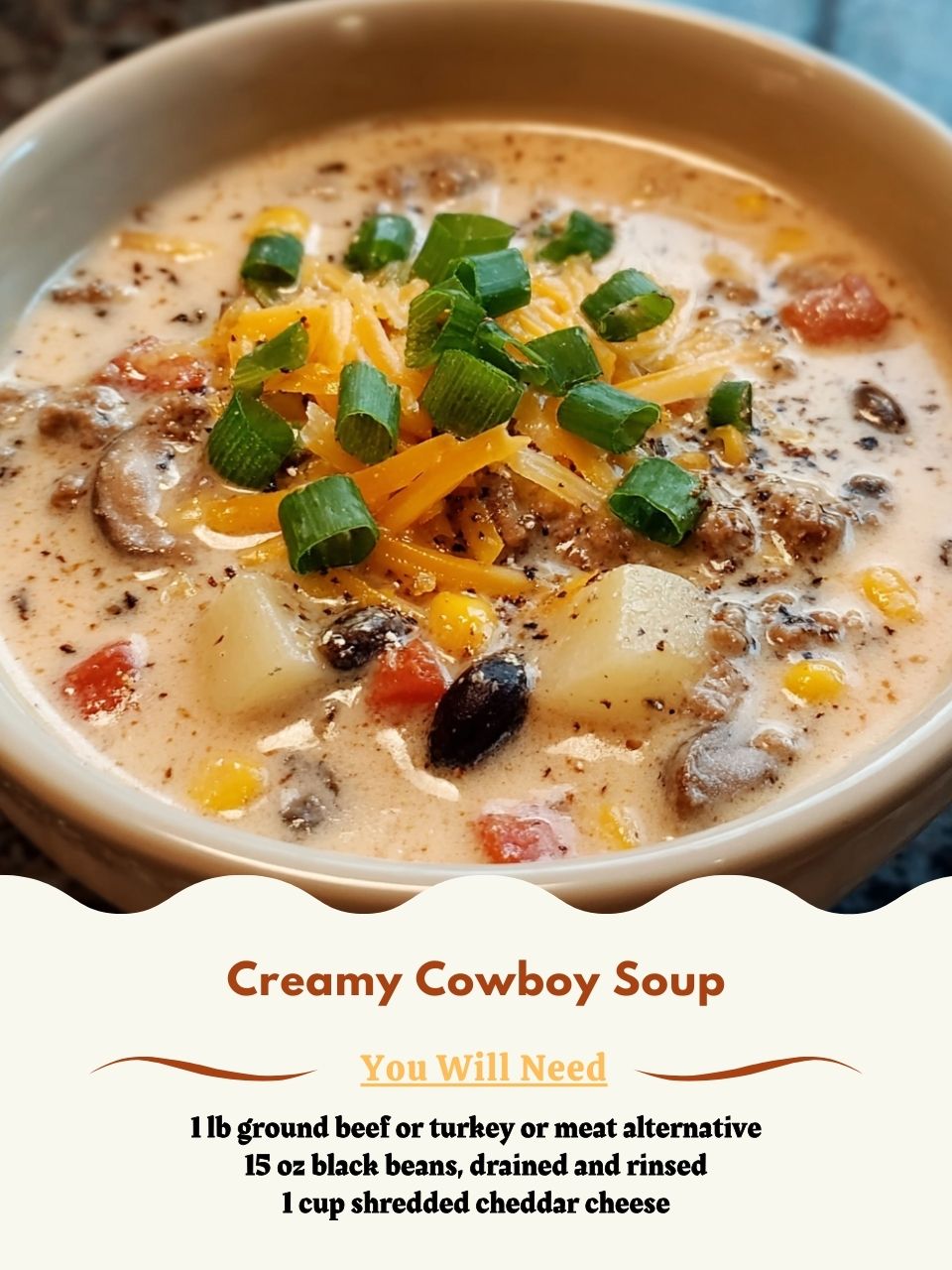 I stumbled upon the idea for Creamy Cowboy Soup on a night when the pantry seemed bare and the weather had turned fiercely cold. I had ground beef, a few cans of beans, and a block of cheese, and I dreamed of a soup that was hearty enough to be a meal but creamy enough to feel like a comfort-food hug. As the onions and beef sizzled, then the tomatoes and spices joined in, my kitchen filled with a smoky, savory aroma that promised warmth. Stirring in the cream and cheese at the end created a rich, velvety broth that was pure magic. Ladling it into bowls, I knew I’d created something special—a rugged, satisfying soup with a surprisingly luxurious soul.