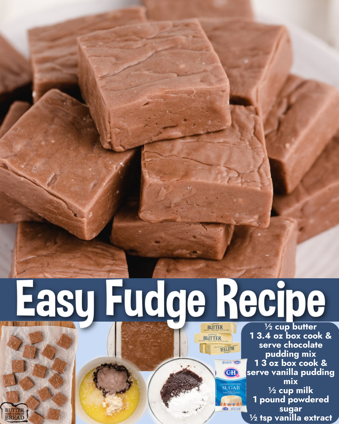I stick with cook-and-serve pudding mix because instant pudding simply doesn’t thicken the fudge properly. The combination of chocolate and vanilla gives the fudge a rich, balanced flavor that isn’t too intense or too sweet. The powdered sugar sweetens and thickens the mixture as it melts in, and the butter gives the fudge its silky smooth texture. You can swap whole milk for 2% if needed, but avoid nondairy milk because it doesn’t thicken the same way.