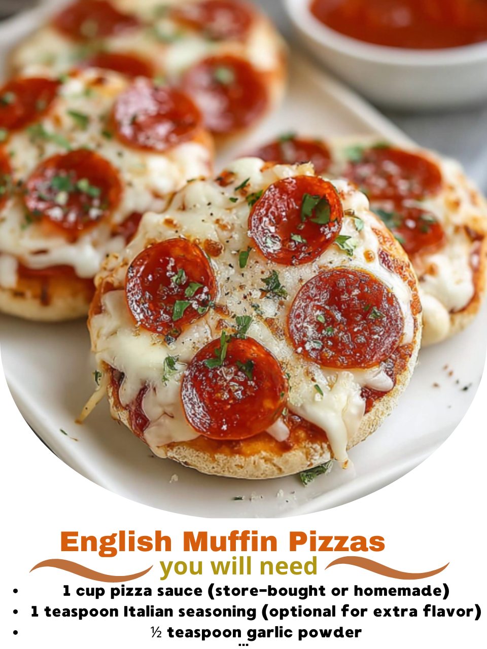 The foundation is classic English muffins, split and lightly toasted for a sturdy, crisp base that stands up to sauce and cheese. Pizza sauce or marinara gives essential tomato flavor, while shredded mozzarella melts into that classic bubbly, stretchy layer all pizza lovers crave.