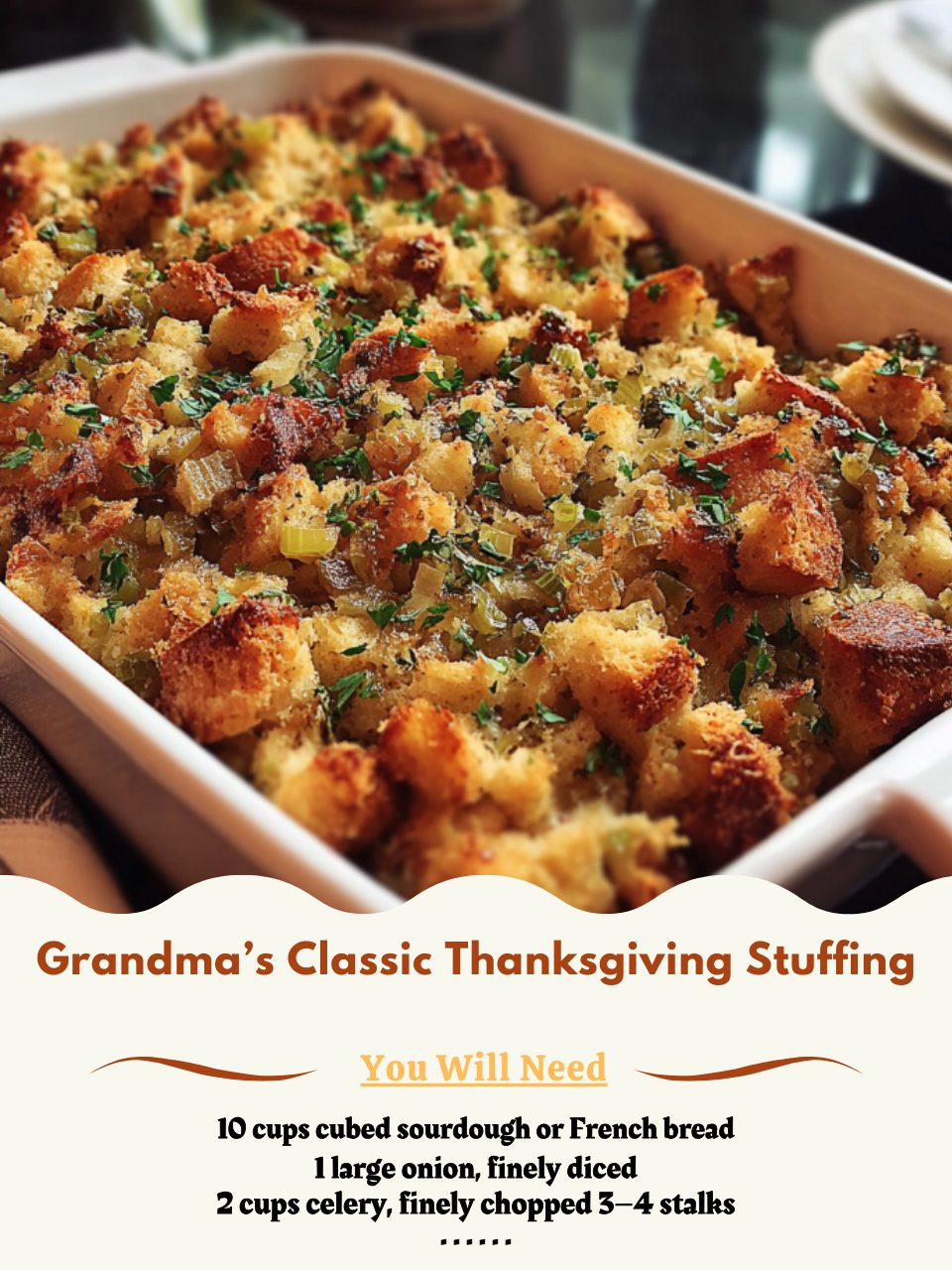 Grandma’s Classic Thanksgiving Stuffing is the dish that brings the whole holiday to life, filling the kitchen with the irresistible aroma of butter, toasted bread, and warm herbs. This recipe has been passed down through generations, the kind of beloved tradition everyone looks forward to all year long. It combines simple ingredients—bread cubes, onions, celery, broth, and plenty of seasoning—into a comforting, savory masterpiece that tastes like pure nostalgia.