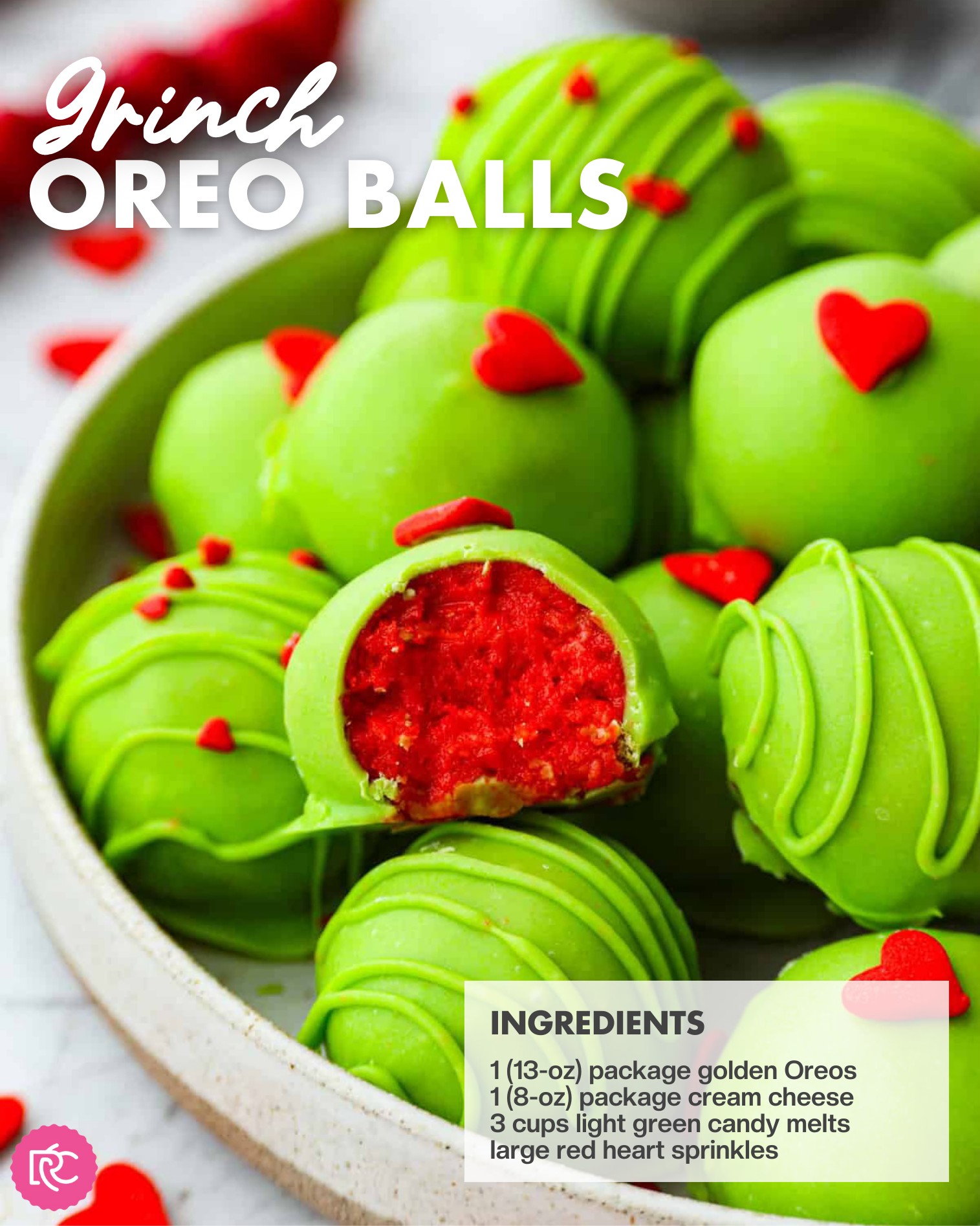 Grinch Oreo Balls are a Christmas twist on classic Oreo truffles: the filling is a simple mixture of crushed Oreo cookies and softened cream cheese, rolled into balls, chilled until firm, and then dipped in green candy melts. While traditional Oreo balls are often coated in white or dark chocolate, the Grinch version uses lime or vibrant green melts and a red heart sprinkle or gel on top to capture the look of the Grinch from the holiday story.