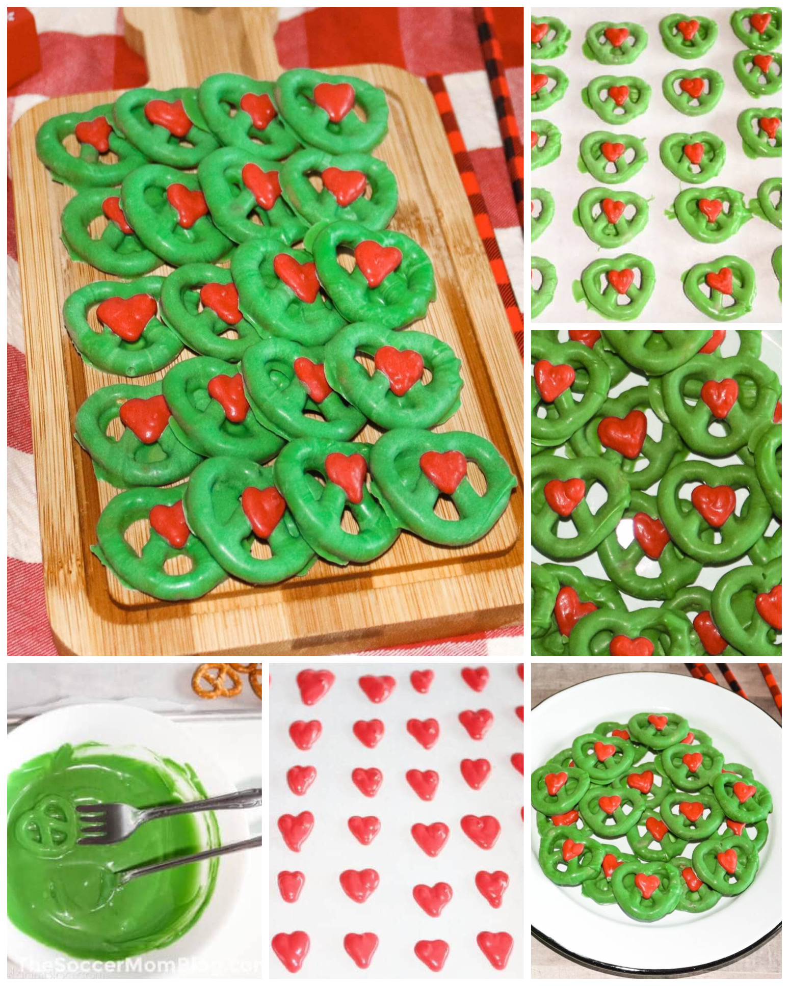 These ingredients are simple, but the magic is in the color and contrast. If you can’t find green candy melts, you can use white melts and stir in a few drops of oil-based candy coloring—just avoid water-based colors because they seize the chocolate. Shortening is optional, but I’ve learned it really helps create that silky dip that coats pretzels evenly. And for the hearts, red melts work best because they pipe smoothly and firm up quickly.