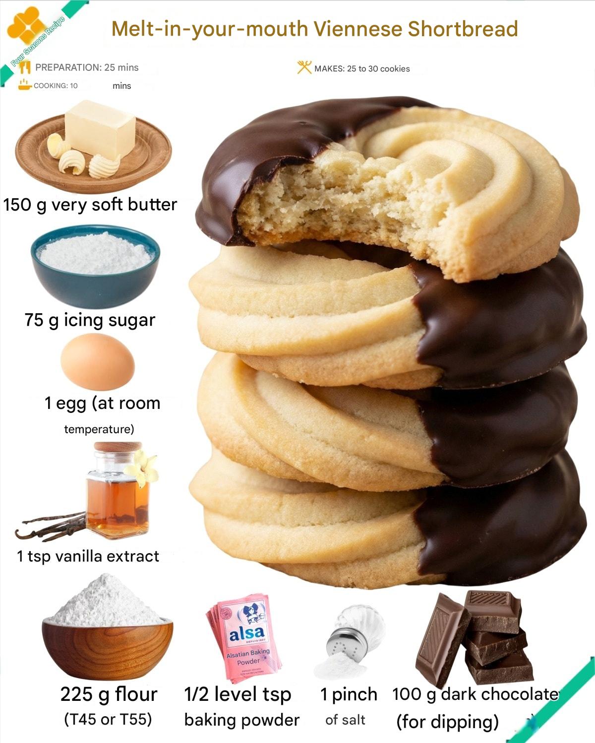 The first time I made melt-in-your-mouth Viennese shortbread cookies, it was on a quiet afternoon when I wanted something comforting but elegant, the kind of bake that fills the kitchen with a soft buttery perfume. As the dough came together in my bowl, I remember thinking how simple the ingredients were, yet how luxurious they felt in my hands. When they baked, the aroma was warm, sweet, and gently vanilla-scented, and the moment I dipped them in dark chocolate, I knew this recipe was going to become a personal favorite I’d return to again and again.