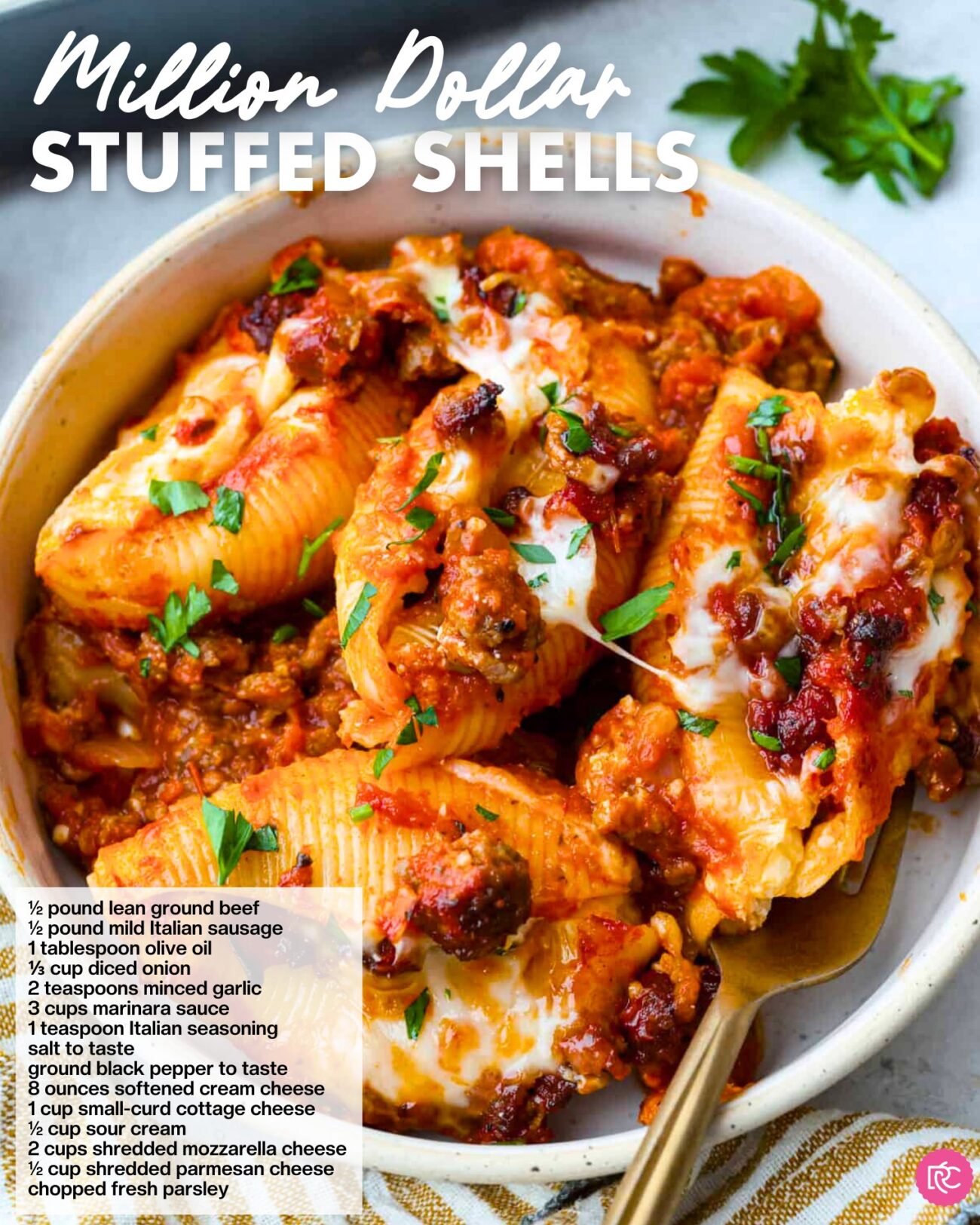 This combines elements from multiple “million dollar” stuffed shell recipes for a classic meat‑sauce version.