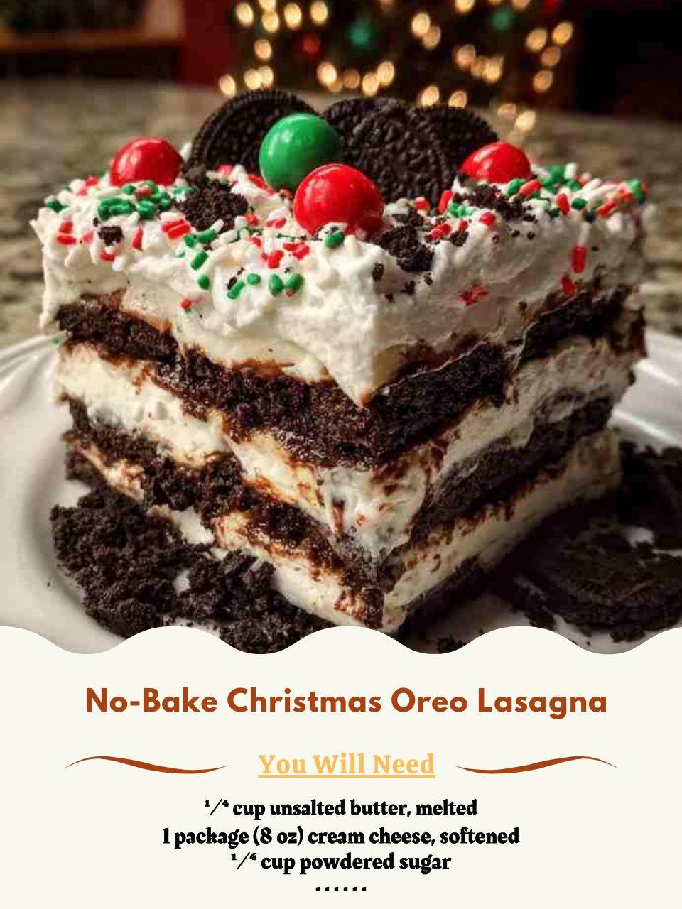 This dessert is a guaranteed hit at potlucks, so bring extra servings—people always return for seconds. For a brunch twist, pair with sweet rolls, fruit salads, or cinnamon-spiced pastries. It also makes a wonderful edible gift: simply portion into small containers, add holiday ribbon, and share the creamy joy. No matter the occasion, this Oreo lasagna adds festive charm and irresistible flavor.
