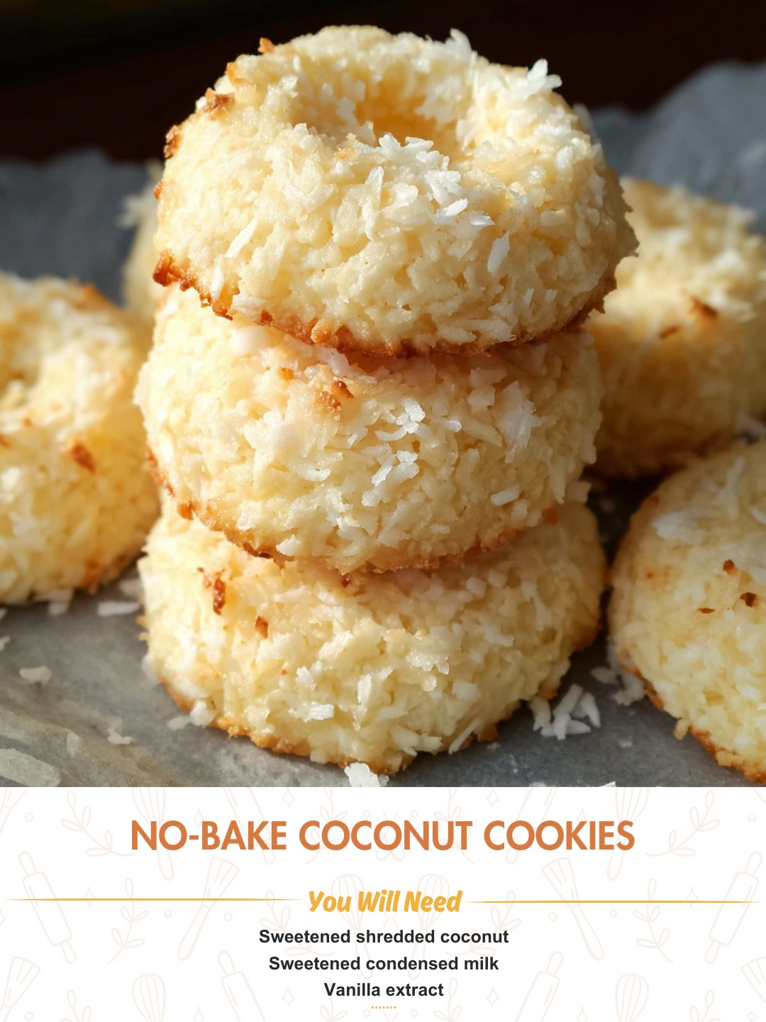 Let’s talk about these ingredients, because quality makes all the difference here. The sweetened shredded coconut is the star; I don’t recommend unsweetened here, as the condensed milk needs that extra sweetness from the coconut to balance perfectly. For the sweetened condensed milk, you must use the full-fat version. I tried a low-fat can once, and the cookies never set up properly—they remained sticky and soft. The full-fat content is crucial for that perfect chewy, firm texture. The vanilla extract should be pure, not imitation. In a recipe with so few ingredients, each flavor note shines, and the vanilla adds a warm, fragrant depth that cuts the sheer sweetness. That tiny pinch of salt? Don’t skip it. It doesn’t make things taste salty; it makes the coconut and vanilla flavors pop and keeps the cookies from tasting one-dimensional.(See the next page below to continue…)