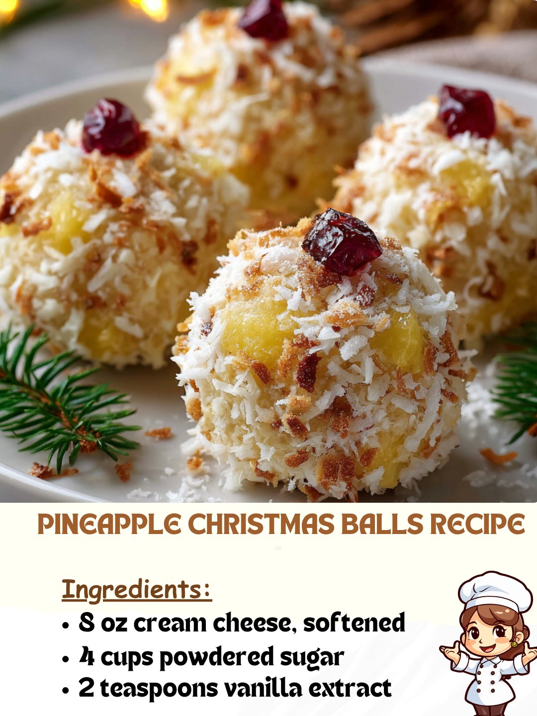 Pineapple Christmas Balls are a bright, cheerful addition to the holiday treat table—bite-sized, no-bake confections blending tropical pineapple with creamy, sweetened coconut, rich cream cheese, and a gentle coating of festive sprinkles or crunchy nuts. Each soft, melt-in-your-mouth ball bursts with flavor, delivering both the tang of fruit and the lushness of classic Christmas desserts.