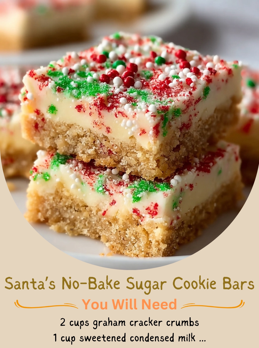 The first time I made Santa’s No-Bake Sugar Cookie Bars, my kitchen smelled like pure holiday magic even though I never turned on the oven. I remember standing at the counter, stirring the sweetened condensed milk into the graham cracker crumbs, amazed at how quickly the mixture transformed into something that tasted just like a soft sugar cookie base without any baking at all. When I poured the creamy topping over the crust and added those cheerful red and green sprinkles, it felt like wrapping a present—simple ingredients coming together to create something impossibly festive.