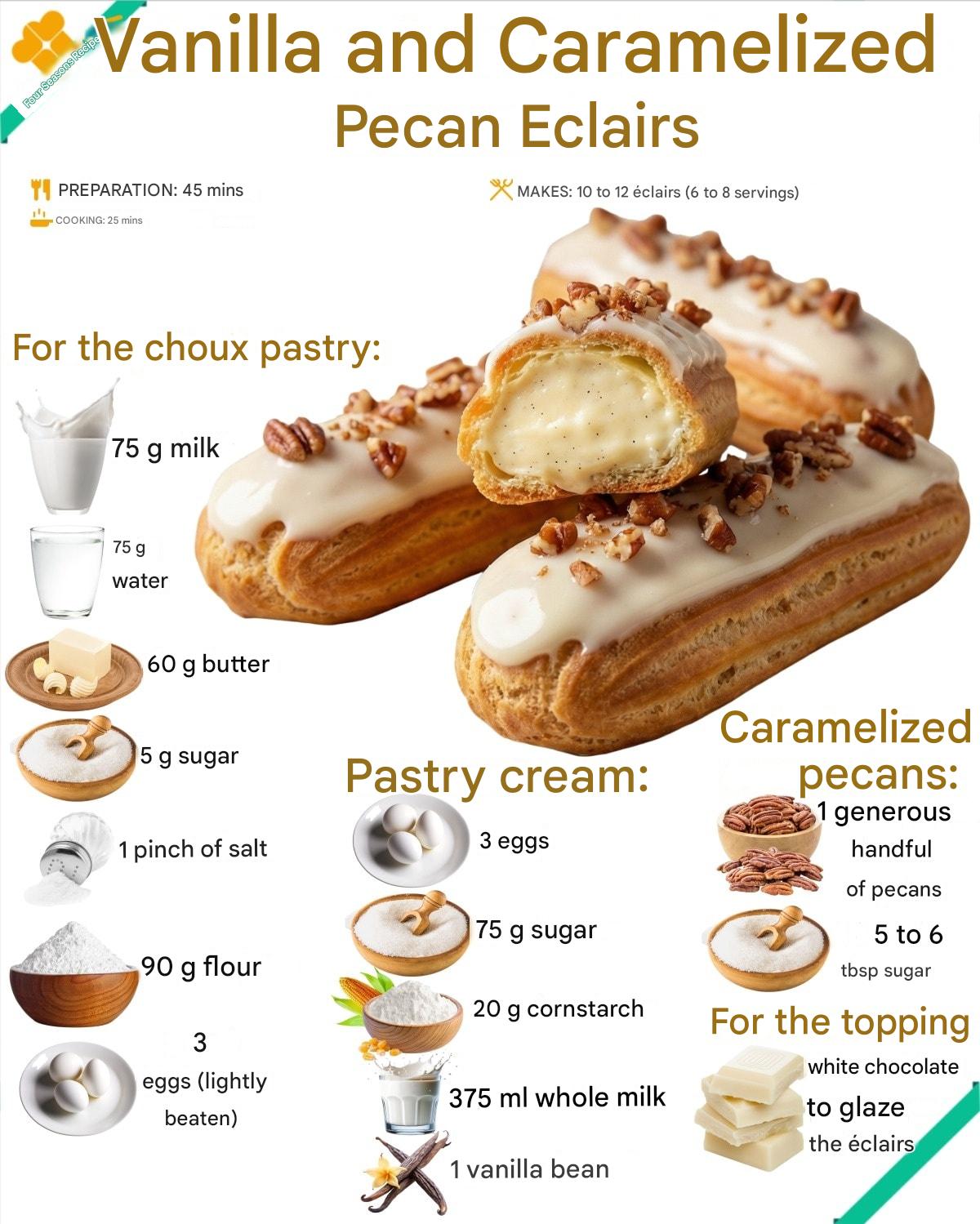 These ingredients work beautifully together to create éclairs that are rich but balanced. You can substitute the vanilla bean with high-quality vanilla paste if needed; it still gives those lovely specks and deep flavor. Whole milk is essential because lower-fat versions result in a thinner pastry cream that doesn’t hold up well inside the éclairs. For the topping, white chocolate melts smoothly and complements the pecans, but you can use milk chocolate or even caramel chocolate if you prefer a sweeter glaze.