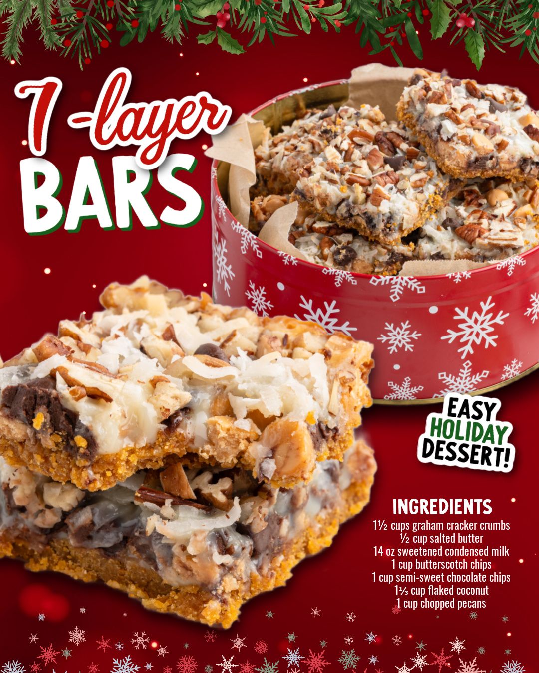 The first time I ever made these Vintage 7 Layer Bars, I was instantly transported back to the holiday dessert tables of my childhood—the ones stacked with tins, trays, and plates overflowing with homemade treats. As the bars baked, my kitchen filled with the buttery aroma of graham crackers and the warm sweetness of bubbling condensed milk, and for a moment, everything felt nostalgic and familiar. When I finally cut into that first batch, I fell in love with the gooey layers, crunchy textures, and the absolute simplicity of the recipe. It’s a dessert that feels like home every single time I make it.