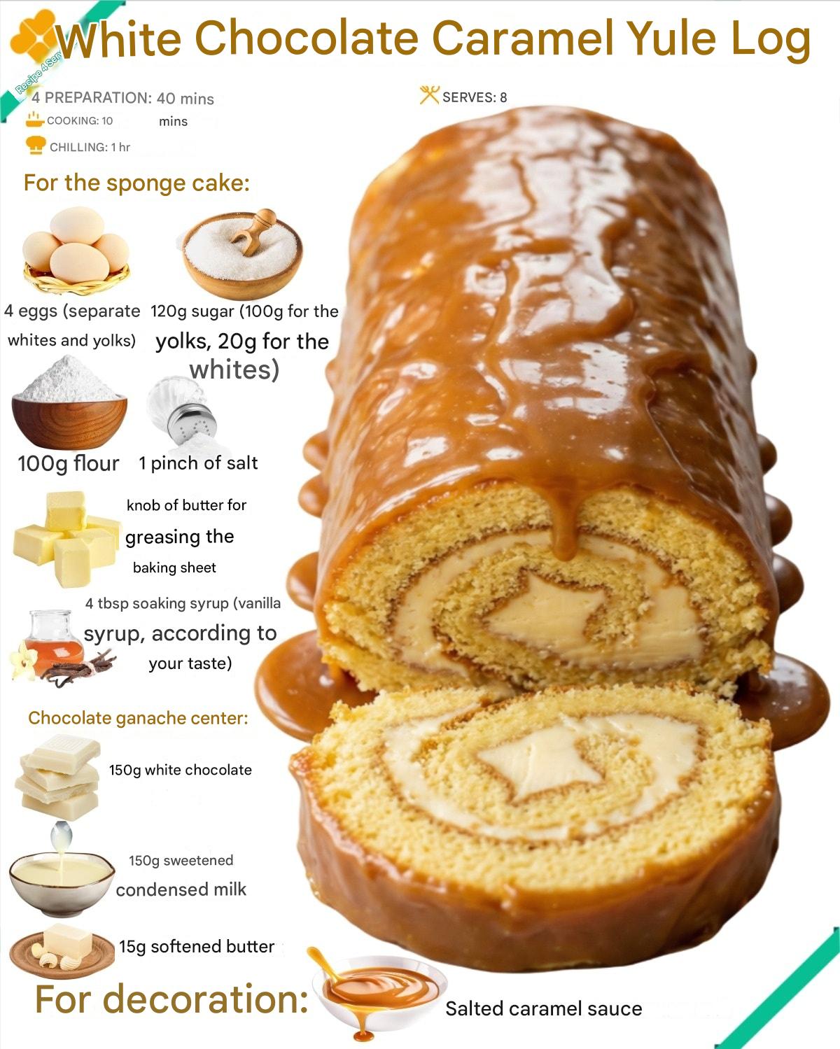 The first time I made a white chocolate caramel Yule log, it felt like I was slowing time down in my kitchen on purpose. The soft hum of the oven, the smell of warm sponge cake, and the gentle sweetness of caramel warming on the stove instantly put me in a festive mindset. I remember carefully rolling the sponge while it was still warm, my hands slightly nervous but excited, knowing this step mattered. When I finally sliced into the finished log and saw that perfect creamy swirl, I felt proud in a quiet, deeply satisfying way that only baking can give.